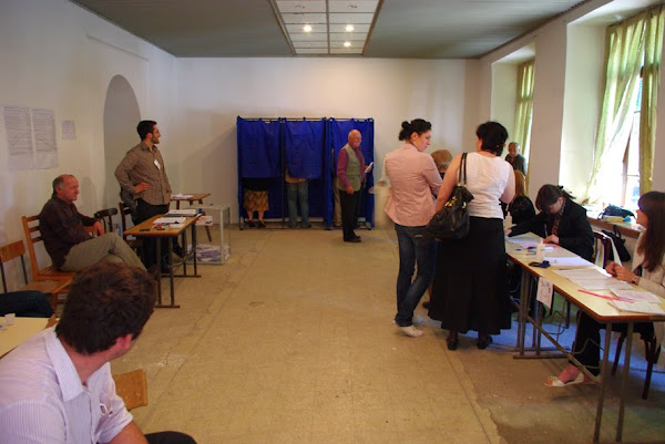 Birželio pradžioje kaip tik pataikėme ant savivaldos rinkimų Gruzijoje (pastebėjau, kad su rinkimais mums sekasi, vis ant jų pataikome skirtingose šalyse bekeliaujant – Ukrainoje, Indonezijoje, Kipre, dar kažkur..), buvo ir nemažai lietuvių stebėtojų atvykę. Tai žinodami pabandėm papokštaut – Mtskhetoje susiradome balsavimo vietą ir įėję į vidų kelių rinkimų prižiūrėtojų pradėjome klausinėti, tarsi būtume rinkimų stebėtojai – kaip vyksta rinkimai, ar viskas sklandu, ar daug žmonių balsuoja. Kažkuris vienas iš rinkimų prižiūrėtojų spėjo klusniai atsakyti į porą klausimų ir įtikinėjo mus, kad „vsio chorošo“, bet kitas prižiūrėtojas mus greit demaskavo (nekeista – atrodėme grynį turistai, po šortais, su fotoaparatais ant kaklo ir tt.) ir išvijo lauk 🙂